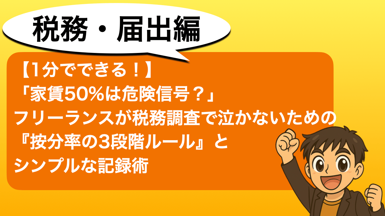 【1分でできる!】「家賃50%は危険信号?」フリーランスが税務調査で泣かないための『按分率の3段階ルール』とシンプルな記録術 2025年11月19日 こんにちは。フリーランスひかるです。 先月、税理士の先生と確…