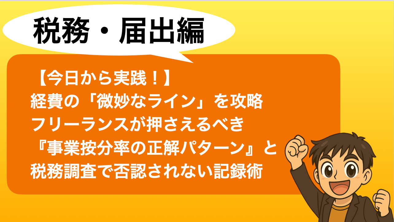 【今日から実践!】経費の「微妙なライン」を攻略|フリーランスが押さえるべき『事業按分率の正解パターン』と税務調査で否認されない記録術 2025年11月14日 こんにちは。フリーランスひかるです。 先日、行きつけのカフェ…