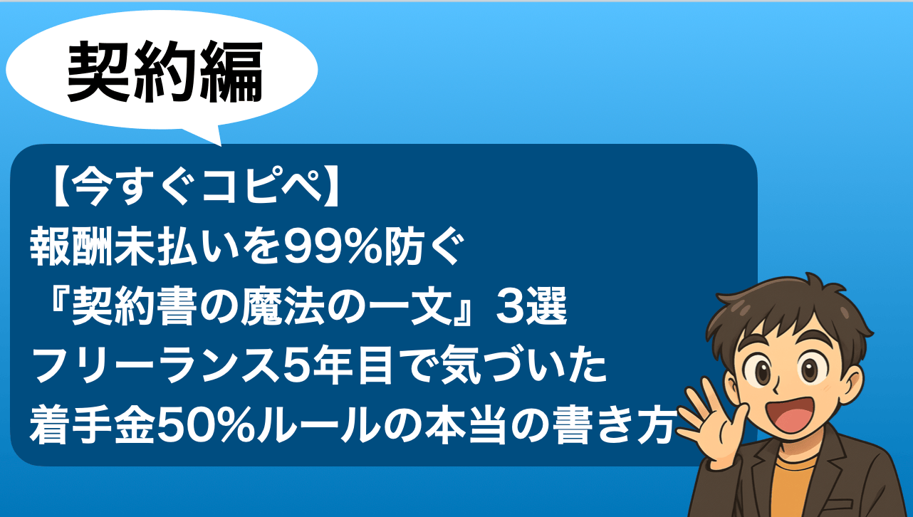【今すぐコピペ】報酬未払いを99%防ぐ『契約書の魔法の一文』3選|フリーランス5年目で気づいた着手金50%ルールの本当の書き方 2025年11月11日2025年11月11日 こんにちは。フリーランスひかるです。 「納品したのに、もう2…