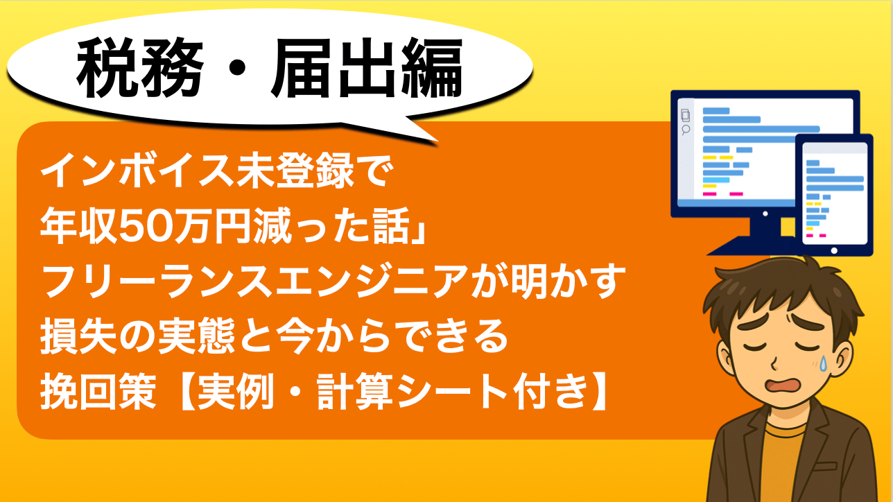 「インボイス未登録で年収50万円減った話」フリーランスエンジニアが明かす損失の実態と今からできる挽回策【実例・計算シート付き】 2025年12月3日2025年12月11日 こんにちは。フリーランスひかるです。 「インボイス制度が始ま…