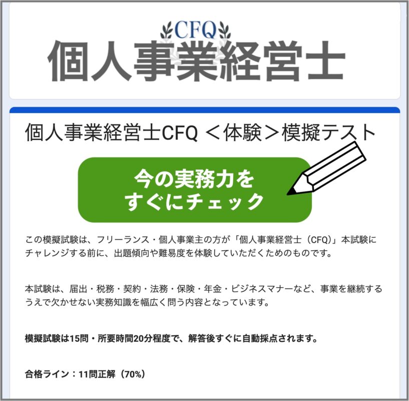 個人事業経営士CFQの模擬試験問題を以下から登録不要・無料で受験できます。