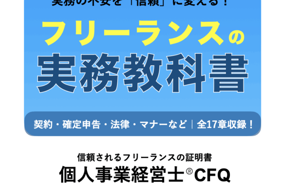 フリーランス実務マスター参考書の決定版 CFQテキストは企業の社内研修にも採用されています 。 『今日から実践!「信頼されるフリーランス」になるための実務教科書』(A5版・226ページ) フリーランスとして、安心して企業 … 続きを読む 公式参考書|CFQ・個人事業経営士