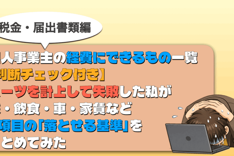 この記事は、フリーランス実務資格「個人事業経営士・CFQ」監修のもと作… 続きを読む »個人事業主の経費にできるもの一覧【判断チェック付き】スーツを計上して失敗した私が服・飲食・車・家賃など9項目の「落とせる基準」をまとめてみた