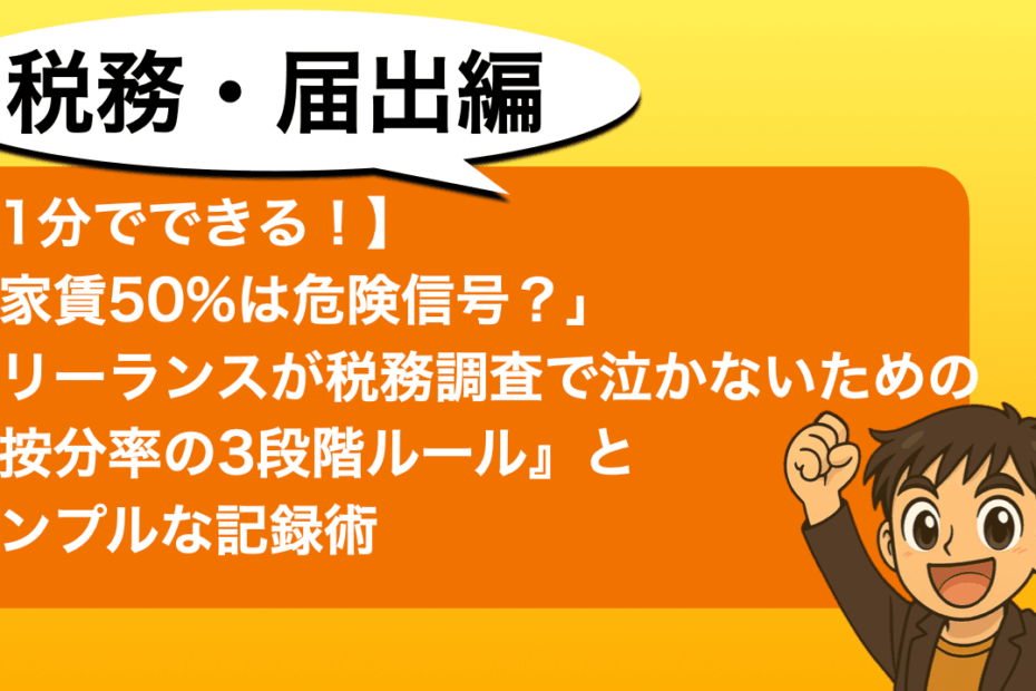 こんにちは。フリーランスひかるです。 先月、税理士の先生と確定申告の相… 続きを読む »【1分でできる!】「家賃50%は危険信号?」フリーランスが税務調査で泣かないための『按分率の3段階ルール』とシンプルな記録術