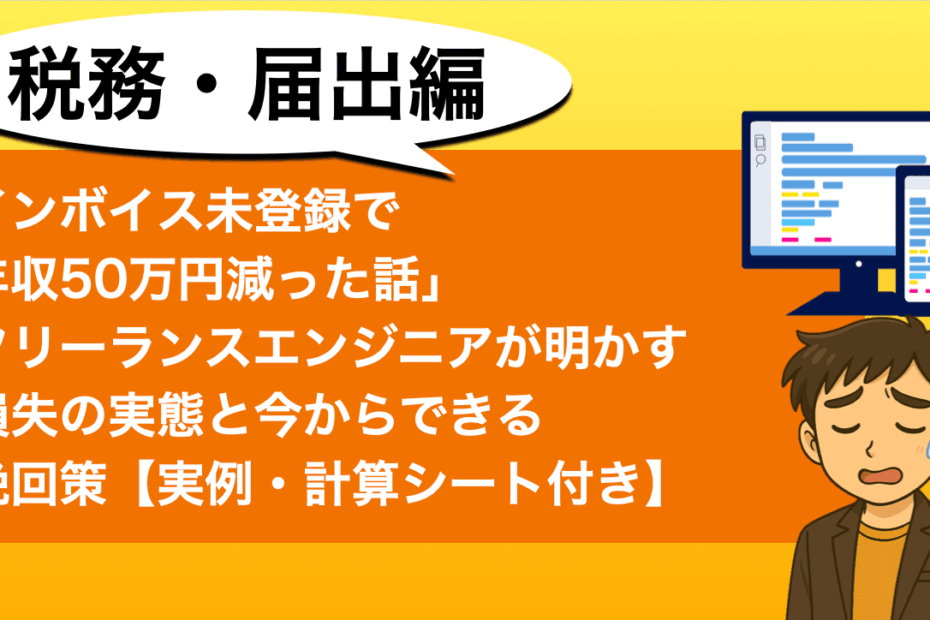 こんにちは。フリーランスひかるです。 「インボイス制度が始まって、なん… 続きを読む »「インボイス未登録で年収50万円減った話」フリーランスエンジニアが明かす損失の実態と今からできる挽回策【実例・計算シート付き】