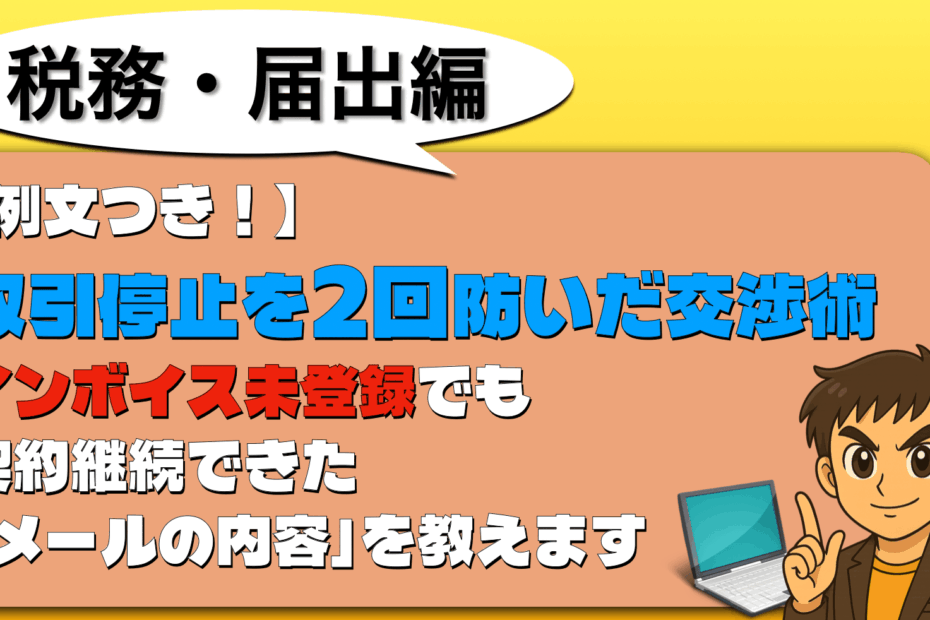こんにちは。フリーランスひかるです。 取引先から「インボイス登録につい… 続きを読む »【例文つき!】取引停止を2回防いだ交渉術|インボイス未登録でも契約継続できたメールの内容を教えます!