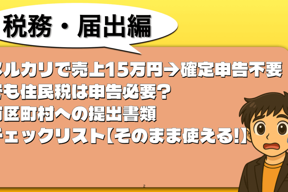こんにちは。フリーランスひかるです。 メルカリで不用品を売っていたら、… 続きを読む »メルカリで売上15万円→確定申告不要でも住民税は申告必要?市区町村への提出書類チェックリスト【そのまま使える!】