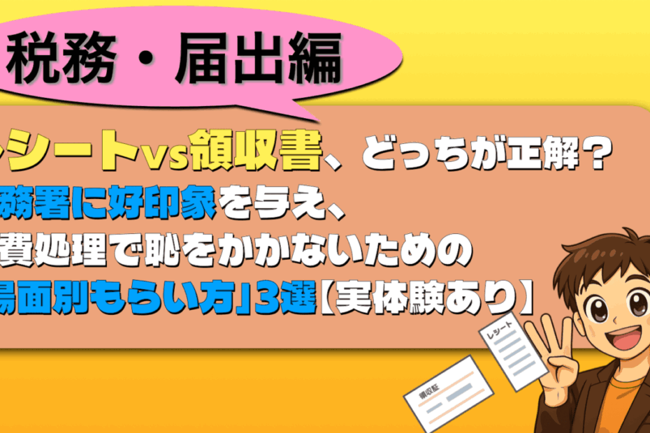 この記事は、フリーランス実務資格「個人事業経営士・CFQ」監修のもと作… 続きを読む »レシートvs領収書、どっちが正解?税務署に好印象を与え、経費処理で恥をかかないための「場面別もらい方」3選【実体験あり】