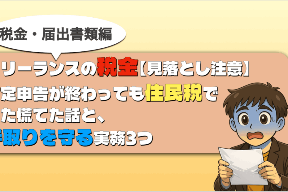 この記事は、フリーランス実務資格「個人事業経営士・CFQ」監修のもと作… 続きを読む »フリーランスの税金【見落とし注意】確定申告が終わっても住民税でまた慌てた話と、手取りを守る実務3つ