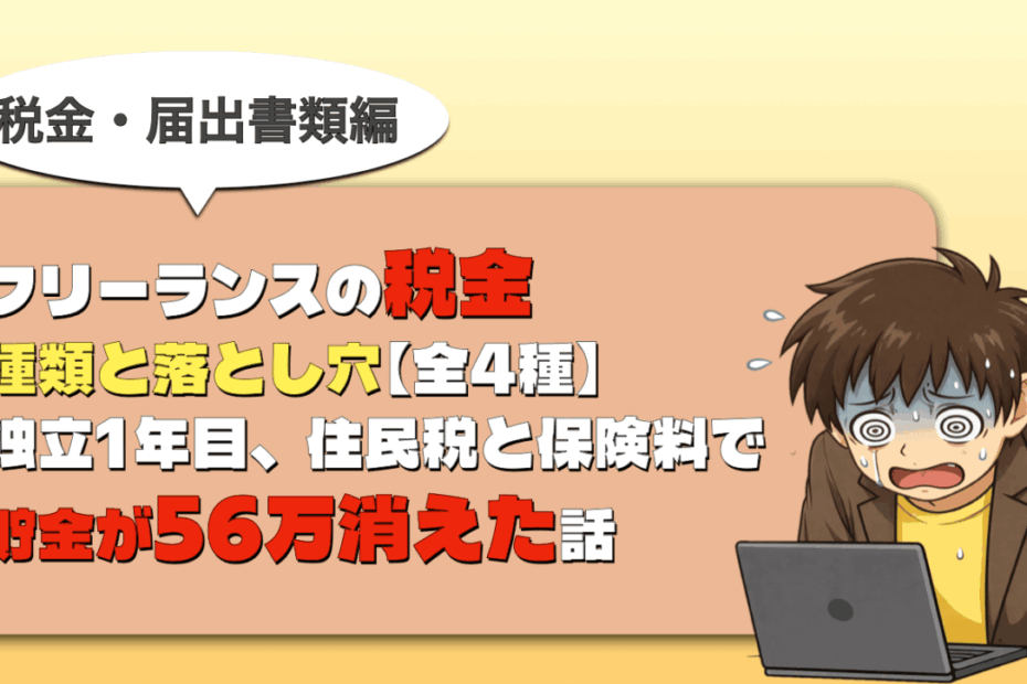 この記事は、フリーランス実務資格「個人事業経営士・CFQ」監修のもと作… 続きを読む »フリーランスの税金 種類と落とし穴【全4種】|独立1年目、住民税と保険料で貯金が56万消えた話